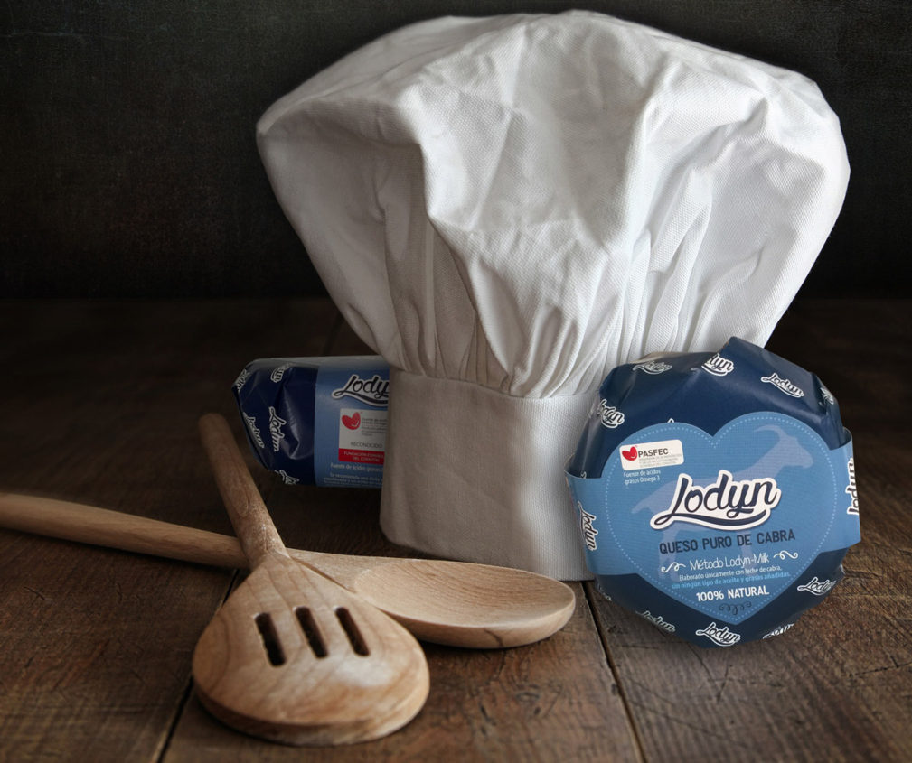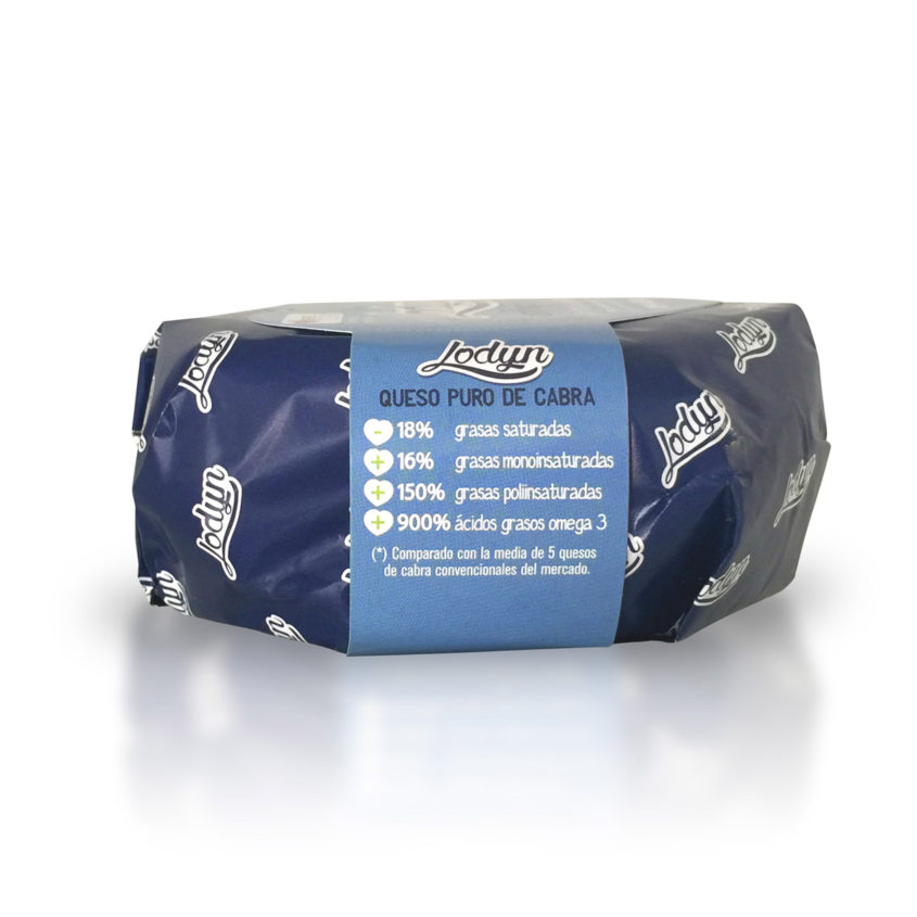 Queso puro de cabra, elaborado con el Método Lodyn-Milk: alimentando a las cabras con un pienso vegetal patentado por Lodyn que hace que las cabras generen, de forma natural, una leche baja en grasas saturadas y con un 600% más de Omega 3.